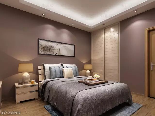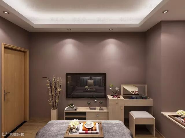 咖啡色墙面提升了整个空间的质感,彰显的了主人高雅的品味。简约的电视柜和梳妆台合二为一,一切都是那么刚刚好。