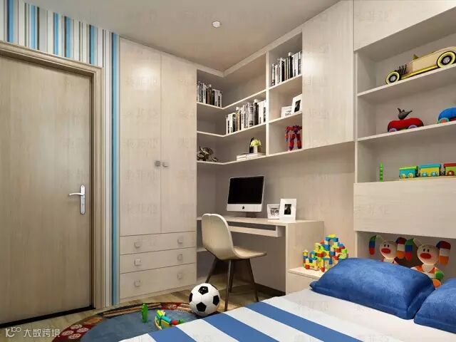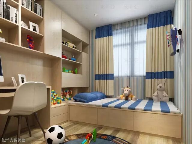 衣柜、书桌、书柜、收纳柜铺满墙面,再加上榻榻米床,孩子的玩具再多也放得下。百搭的枫木色经蓝色点缀,多了一份天真的童趣。