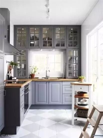 1、没有自然光进入的厨房,橱柜的颜色可以选择浅色系,让人看起来清新明亮;