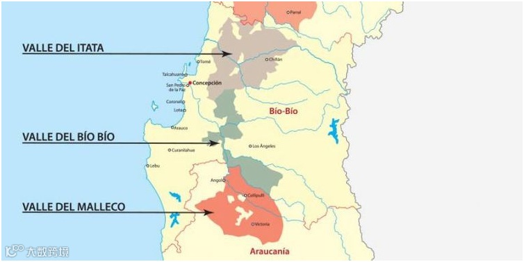 南部产区由伊塔塔谷(Itata Valley)、比奥比奥谷(Bio Bio Valley)和马勒科谷(Malleco Valley)三个子产区组成。