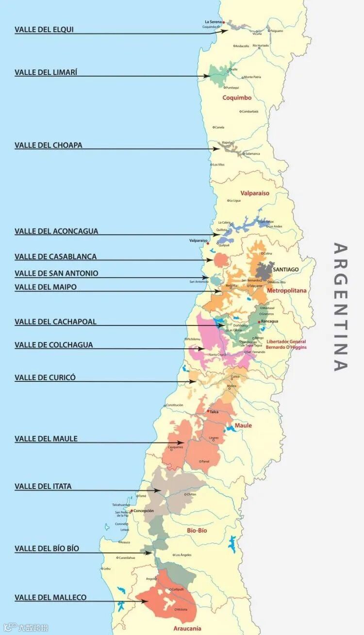 智利葡萄酒是在20世纪90年代以后才逐渐走向了世界,由于低税、口味独特等优点,深受大众喜爱。因为智利独特的气候,其生产的葡萄别有风味,为其产出优质葡萄酒奠定了基础,再加上欧洲古老的酿酒方法,使得酿制出智利葡萄酒既有欧洲传统,又不失南美风味,给人一种新旧交叠的感觉,这也是智利葡萄酒的独到之处。今天,我们带领大家全面了解智利的风土及重点产区。