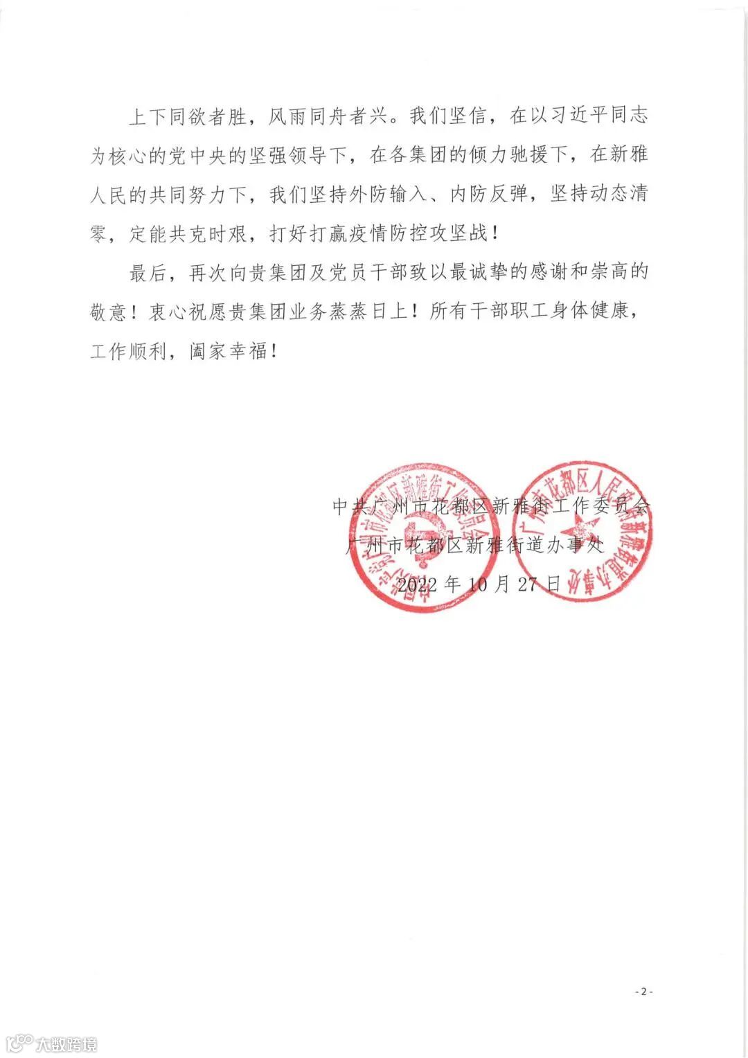 历经13天日夜奋战,广州城更支援花都抗疫突击队与珠江健康抗疫突击队同心协力,累计完成高风险区外围8栋楼,合计384户居民的入户摸查;协助街道完成管控小区全域约9000人7天的核酸检测任务、支援网格区域人员开展全域近3000人核酸检测、1620户入户查册等防疫工作,协助公安干警、村委干部转运红码人员,协助公安干警通宵值守重点路口,扎实完成各项疫情防控工作任务,用点滴行动汇聚成花都区新雅街疫情防控的铜墙铁壁,获得当地街道办事处赠送锦旗、感谢信。