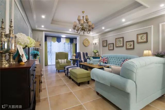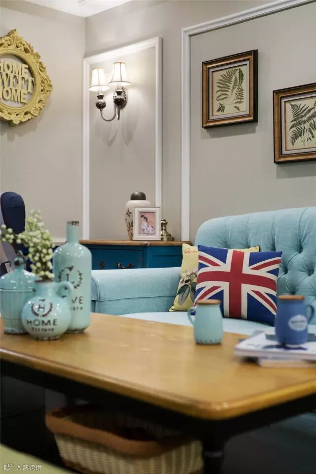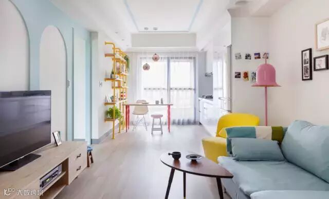 整个客厅都弥漫着一股小清新的味道,清新却能不显幼稚,天蓝色布艺沙发搭配粉色落地灯。