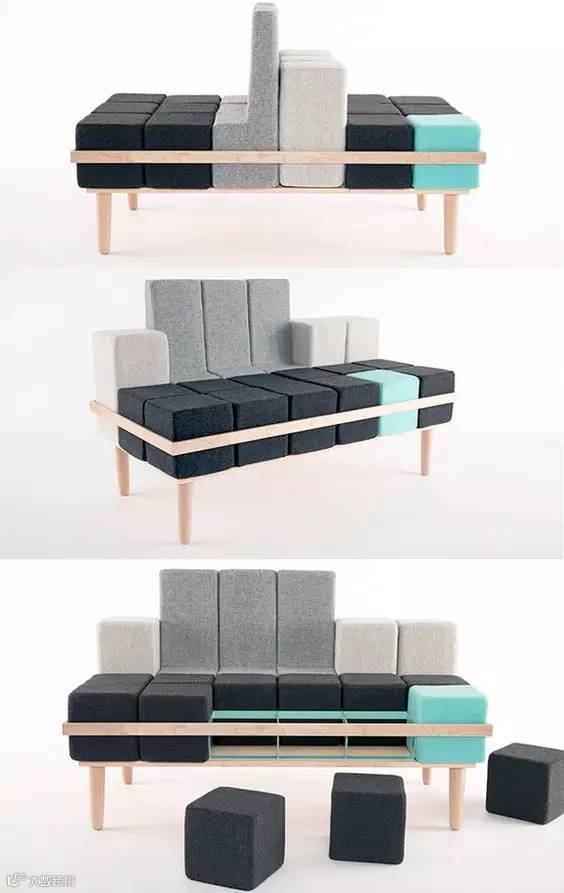 两个背靠背的连体沙发,一张长沙发,把立方体拿出来还变成了沙发凳。这个沙发充满了无限可能。