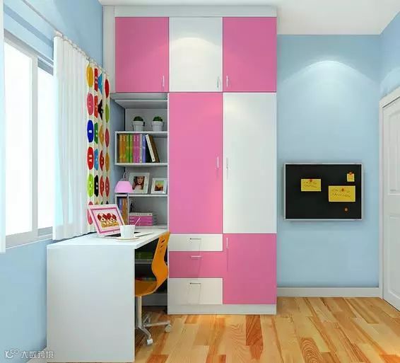 墙面铺贴粉色瓷砖,右侧设置了一个天蓝色衣柜,增加存储空间。角落里放置一个小型卡座。