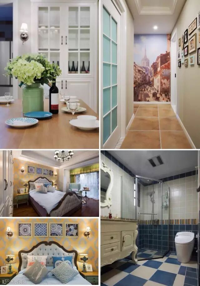 略带复古木色的家具,与仿古砖的色彩呼应,避免纯粹蓝色带来的冷的视觉,与阳光沙滩蓝天白云的干净更为接近。