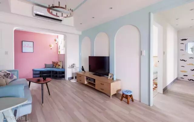电视背景墙做成拱门形状,蓝白相间,颇有地中海风味道,清爽的色彩也给炎炎夏日注入丝丝凉意。彰显轻松闲适的居家氛围。