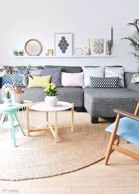 ▲糖果色抱枕、茶几+明亮花卉大叶绿植+多个趣味摆件=明快活力的风格同是北欧风,也会有不同气质。