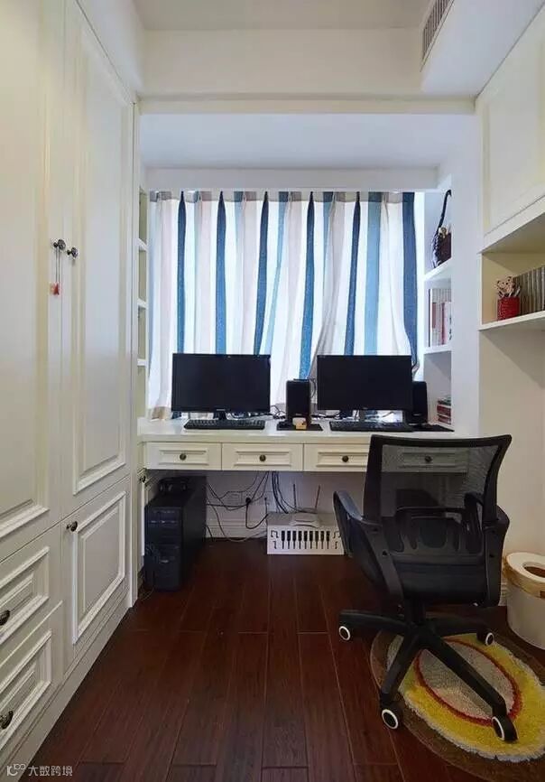 书房的照片,书桌的摆放形式,可以两个人同时使用。