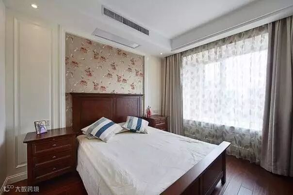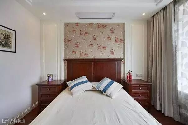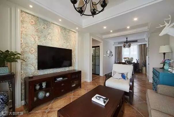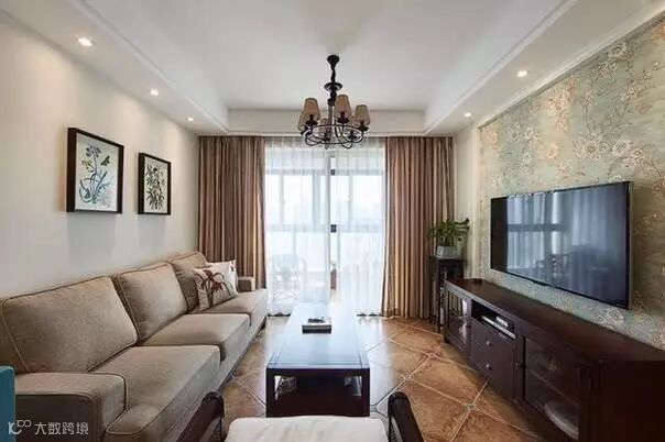 电视背景墙比较简洁,花纹壁纸铺贴。
