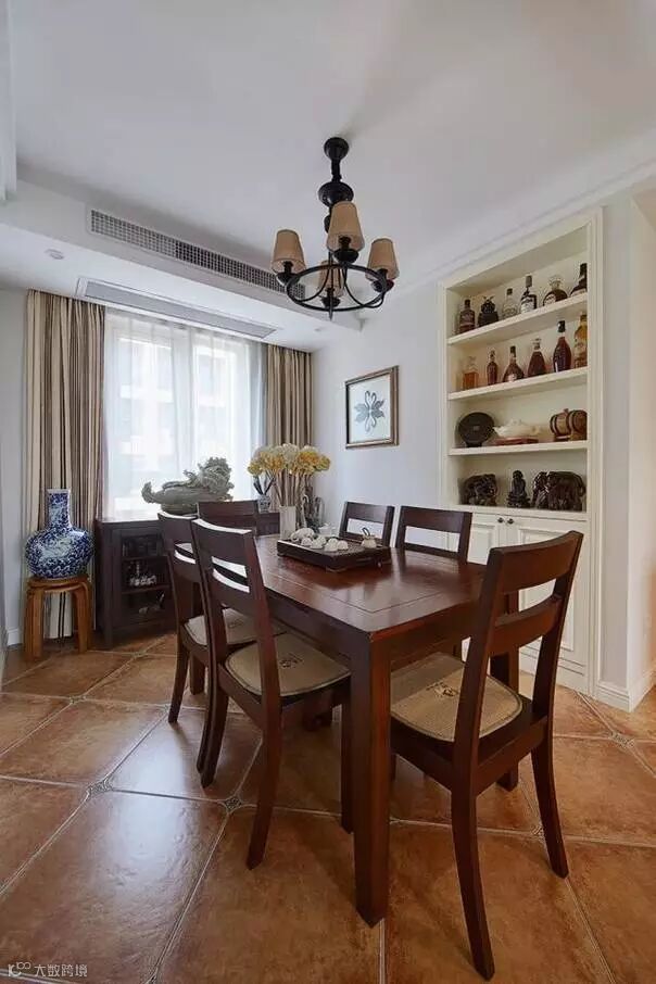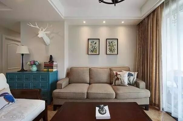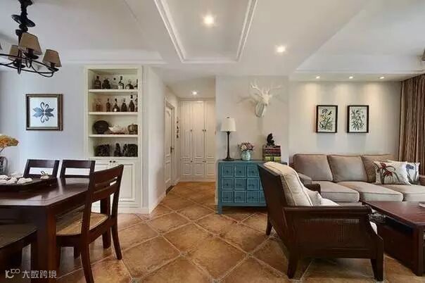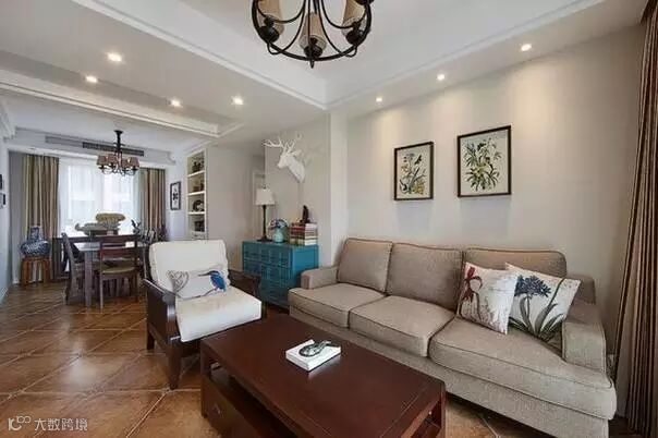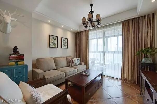 窗帘和沙发的颜色进行了呼应,与地砖保持了同一个色系。