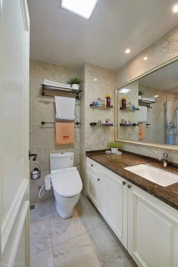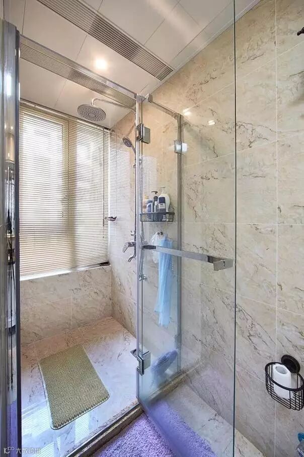 淋浴区的玻璃淋浴房。这是很实用的美式风格,耐用、耐脏、不浮躁,年轻人能接受这种低调风格的好像不多吧?