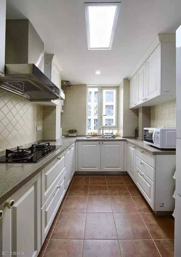 厨房里面的布局,灶台墙砖菱形铺贴,非常好看。
