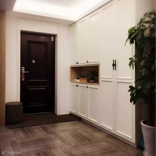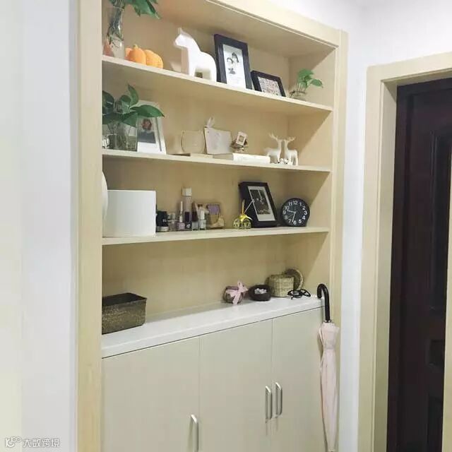 门口定制了内嵌式的鞋柜以及展示柜,进门时可以随手把钥匙和伞放在柜子上。
