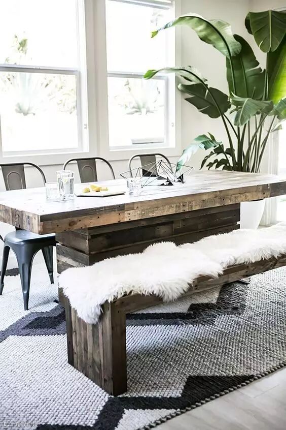 ▲▼成套的餐桌椅也许太沉闷无聊,加入一条长板凳,打造与众不同的乡村风格,同时与家人的距离也拉进了。
