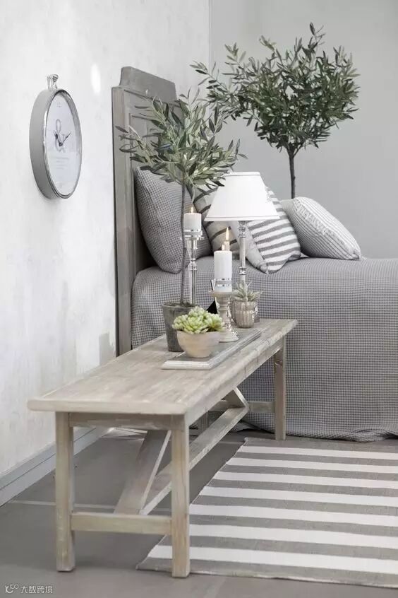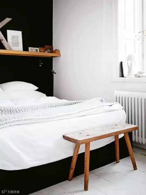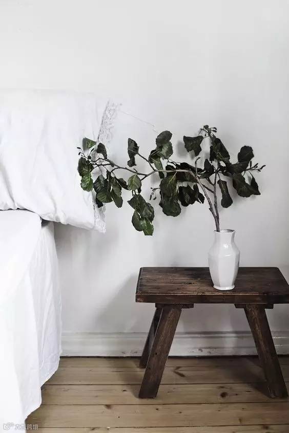▲▼床头 | 抛开笨重的床头柜,摆上一盆植物,与木质板凳搭配自然,清新感扑面而来。