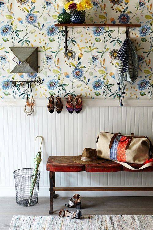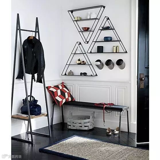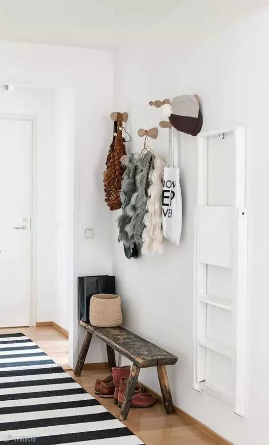 ▲▼窄长形的板凳与玄关狭长的空间形态相当契合,长板凳下面可整齐排放鞋子,上方可以放置杂物,还能坐上去换鞋。