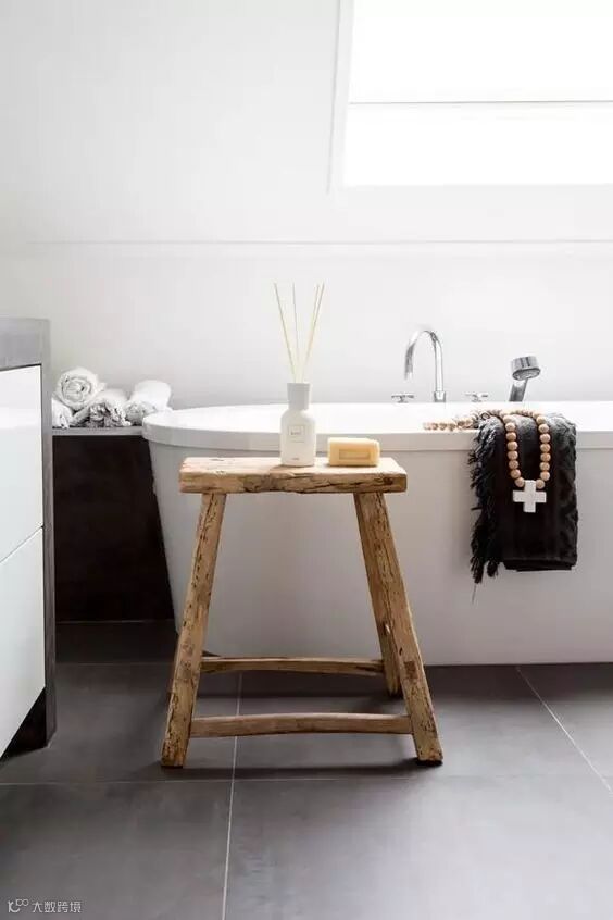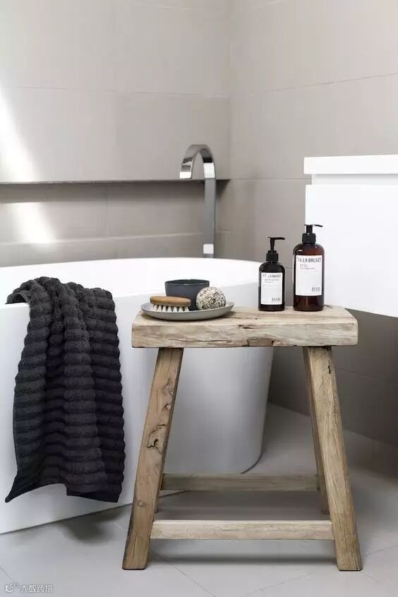 ▲▼旧板凳不怕被浴室的水淋到,收纳香薰、浴巾以及沐浴护肤品,实用又美观。