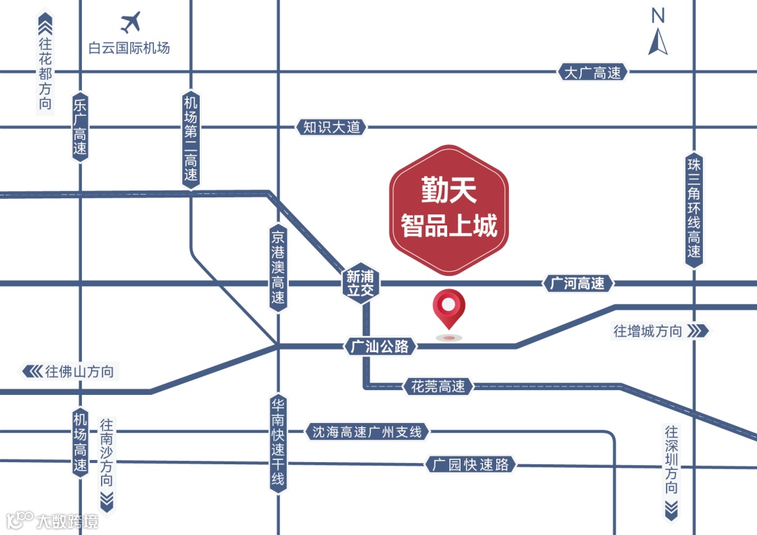 周边广汕公路/广佛高速/华南快速等道路环绕,驾车45分钟内即可到达白云机场、广州南站等交通枢纽。