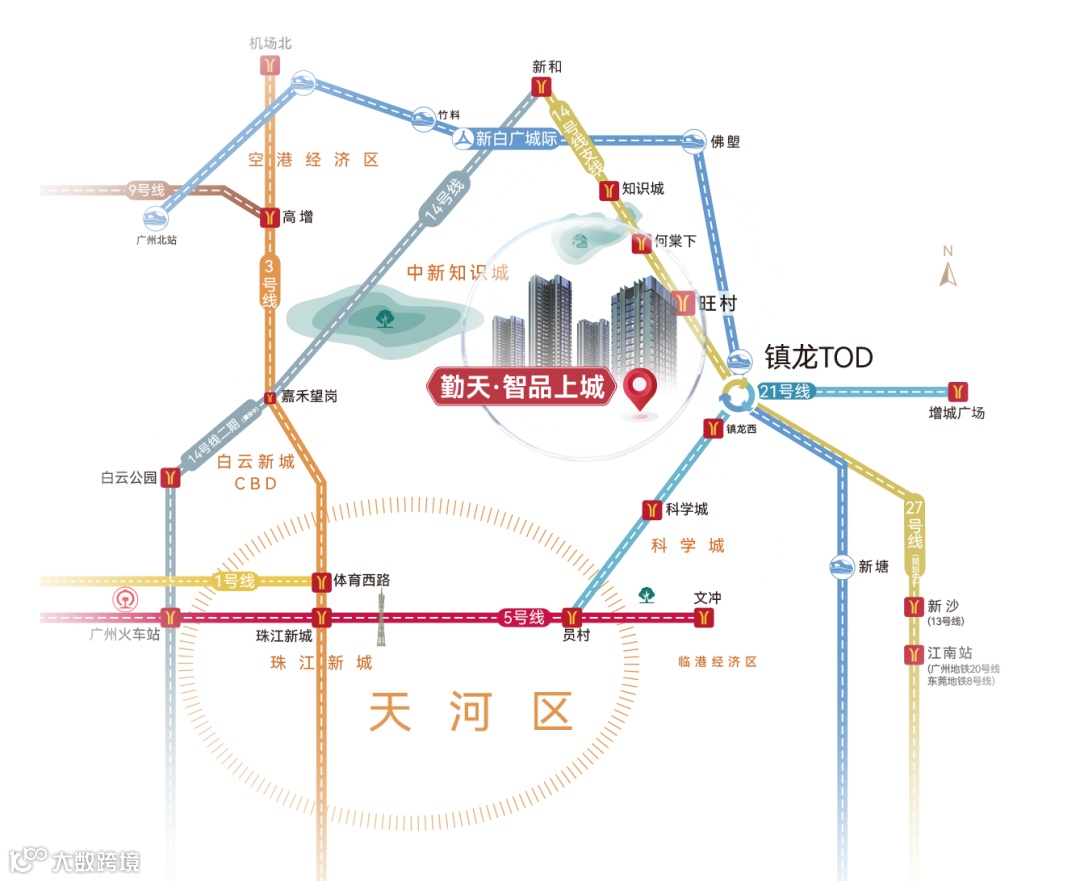 项目距离镇龙TOD仅3km(直线距离),门口即地铁21号线镇龙西站,地铁1站到镇龙站,快线4站到天河,坐享便捷交通。