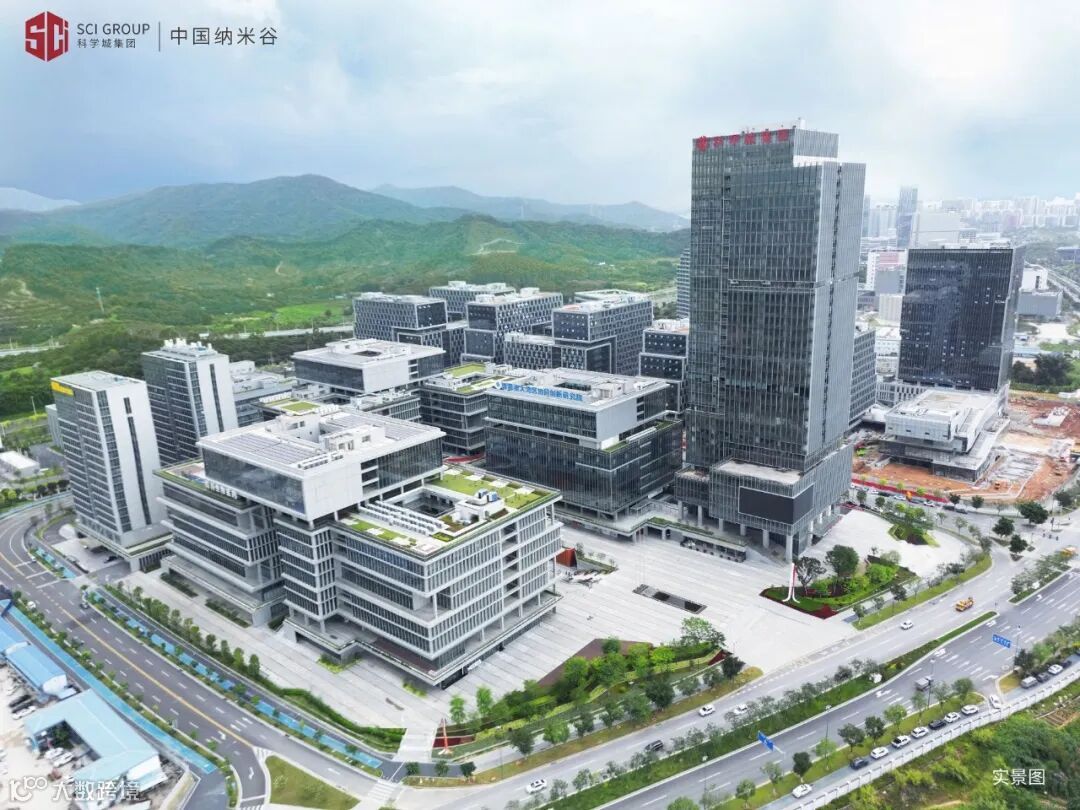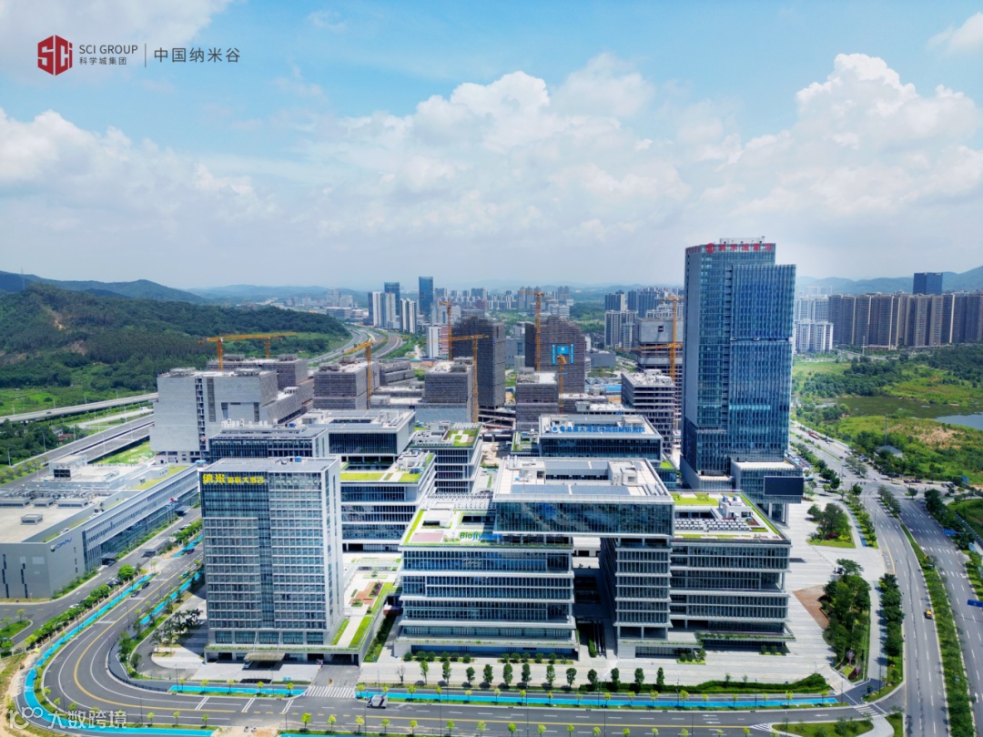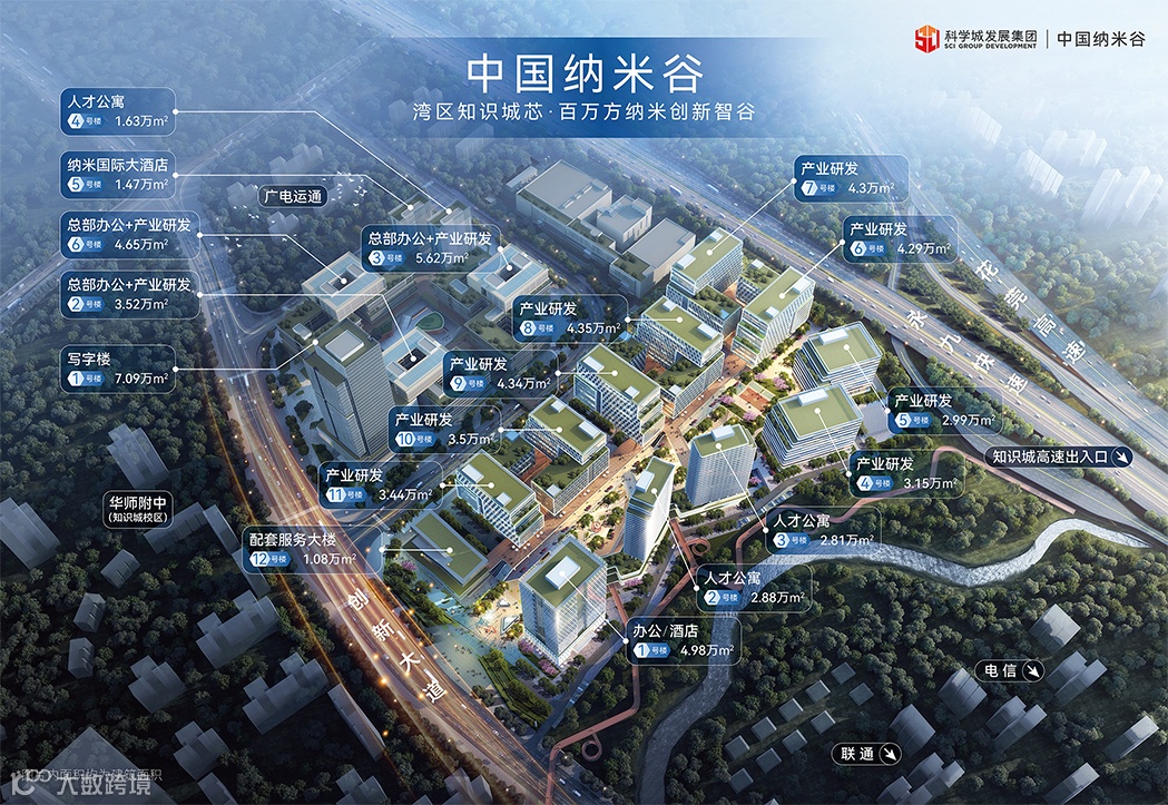 中国纳米谷位于广州市黄埔区知识城南起步区核心位,项目总建面约100万㎡,分为三期开发:一期为科信产业园,总建面约36万㎡,涵盖了1栋高层写字楼、3栋新型研发厂房、1栋人才公寓及纳米国际大酒店;二期为科纳产业园,总建面约58万㎡,涵盖了2栋人才公寓、1栋办公楼+酒店、8栋新型研发厂房;三期为科讯产业园-5G滤波器定制项目,总建面约2.8万㎡,是黄埔区重点引进的项目——广东粤港澳大湾区国际纳米科技创新研究院。