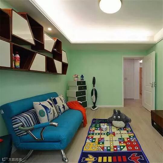 纯净的清水蓝墙面,搭配出视觉上的清凉之感,整体舒适自然,墙上的白色置物架,装饰了客厅又满足了平时的收纳功能。