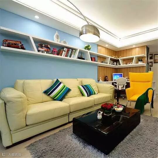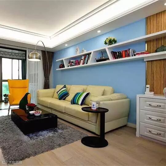 沙发背景墙是淡蓝色的,上面白色的收纳架很有设计性,可以摆放一些小饰品和书籍。