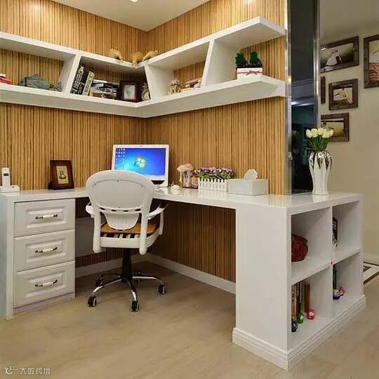 转角书架和弧形书桌的搭配将转角的空间很好的利用了起来,转角设计的书架,低矮的造型更能方便有孩子的家庭。