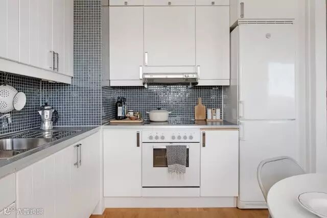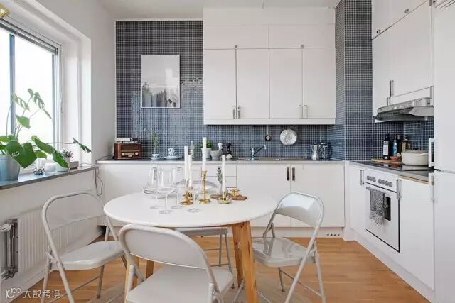 ▲ 深色的墙面衬托出白色橱柜和餐桌的清爽