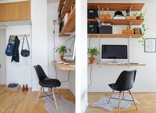 ▲ 利用好墙面空间,用隔板来做书桌和书架