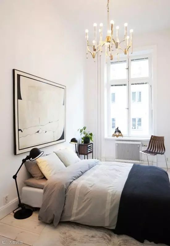 面积不大的小卧室,最好用浅色调来装扮。白色墙面与浅色木地板营造明亮的空间视觉,深浅有致的床品搭配平衡了空间色彩。