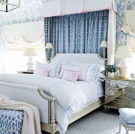 蓝色调拥有独特的优雅魅力,如果喜欢蓝色的话,可以用浅蓝色壁纸铺贴墙面,用浅蓝色地毯铺满地面,再用颜色较深的布艺进行点缀,一间气质非凡的卧室就布置完成了。