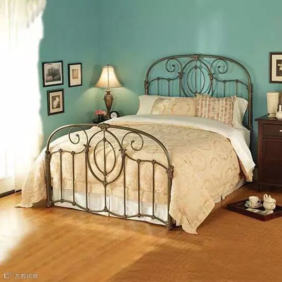 墨绿色的墙面与色彩明亮的木地板构出一幅复古味道十足的画面,传统的欧式铁艺床与古朴的木质家具,是复古迷所钟爱的搭配。