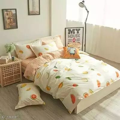淡雅的米色墙面和浅色的木地板,让整个卧室空间有了一种简单纯粹的格调。搭配一套水果图案的床品,让卧室氛围显得格外轻快活泼。