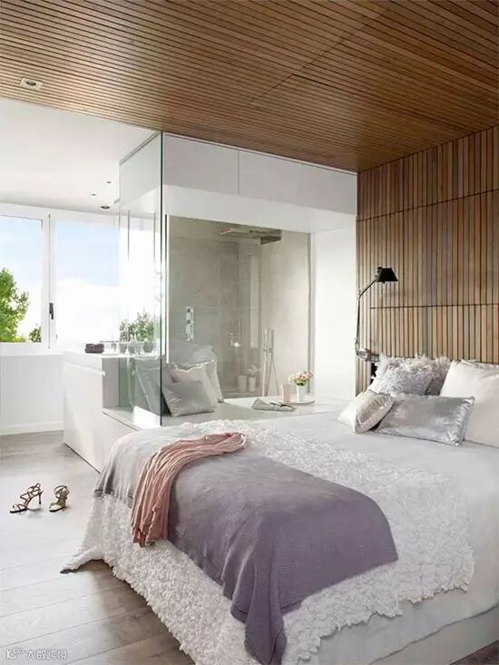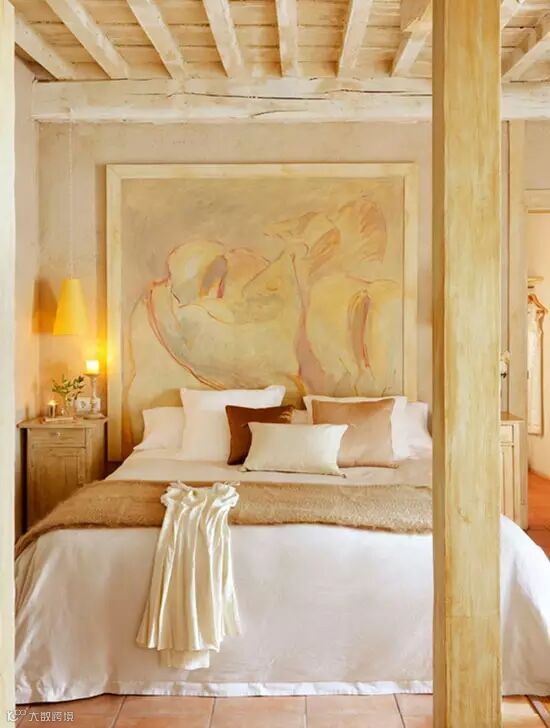 用木板条将床头和天花板铺满,营造出一个接近纯天然的自然空间,处在卧室中仿佛置身大自然,让原木的轻柔伴你入梦。