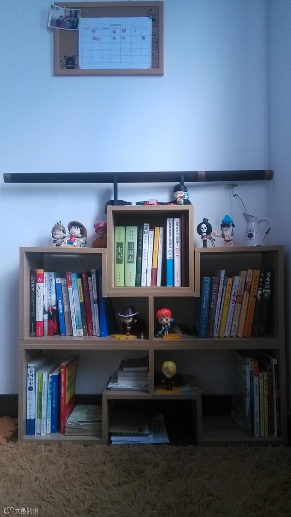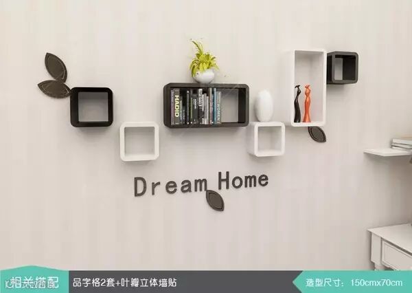置物架的样式繁多,有如图上方形的,也有破浪形(墙上书架),一字形等等。一般店里还有 3D 贴图(类似上图树叶和字母)出售的,可以自己 DIY 来装饰墙壁。