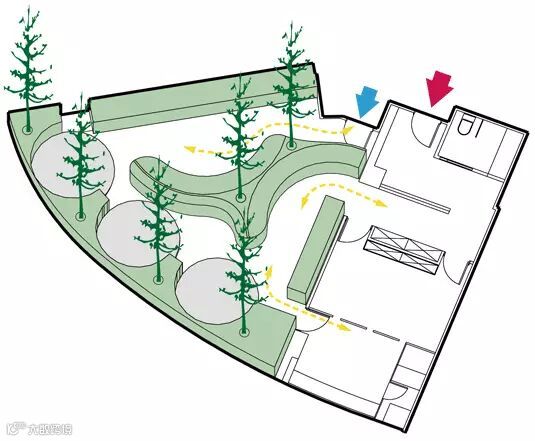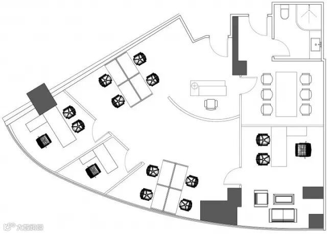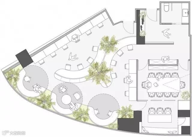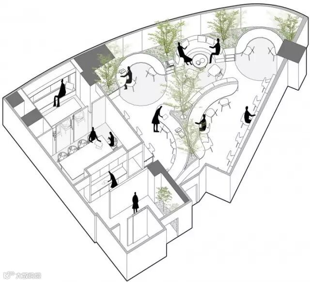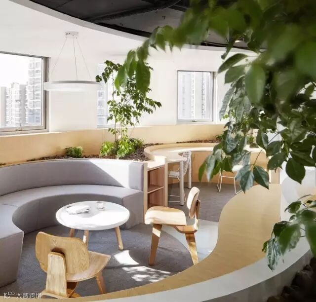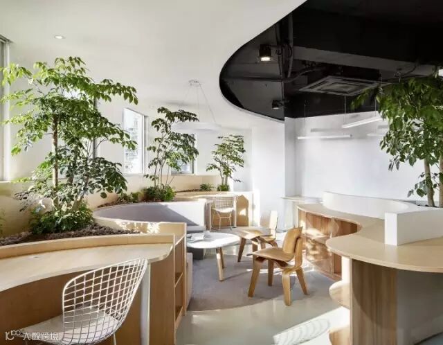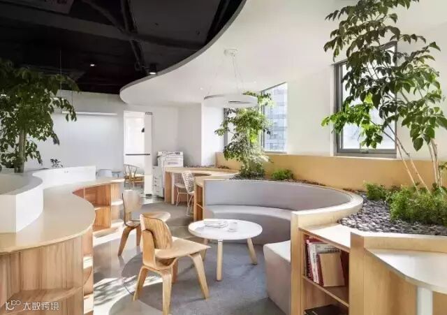 此项目是将高层商务楼内的一处办公空间进行改造。客户希望在钢筋混凝土中享受来自大自然的气息。设计师摒弃了传统的格子间办公风格,一改严肃的办公氛围,用曲线将天花、墙面、桌面、书架整合,并将森林搬进空间,使得新的内部空间开放且富于生机。...