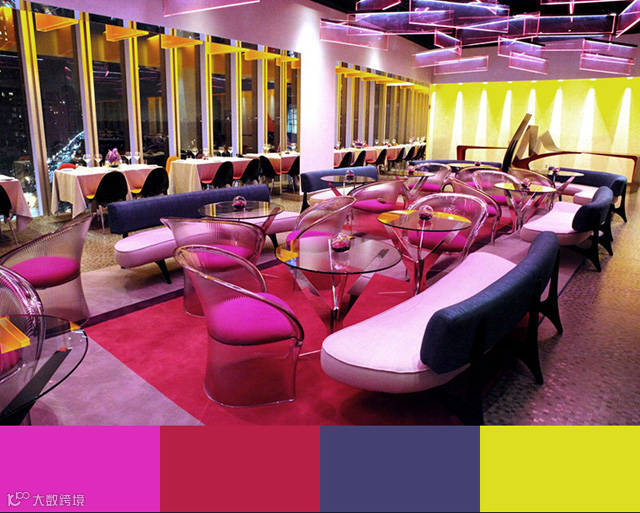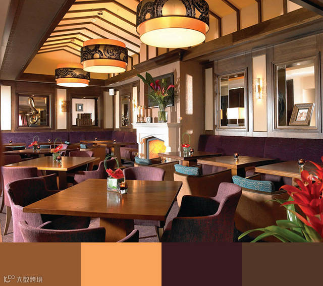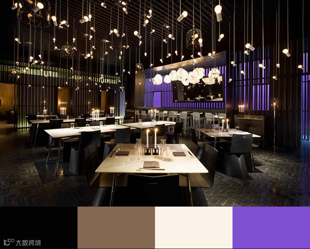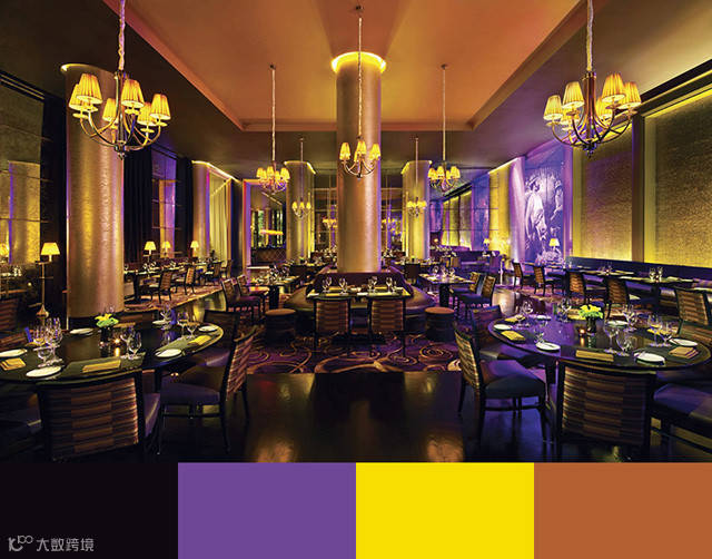在最后,我们可以看到,金色和紫色常常代表高贵奢华,金色或紫色的配色方案通常是高级餐厅在室内设计当中的最好选择。