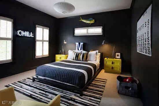 纯黑色的墙壁给人十足的安全感,最硬朗的颜色被姜黄色的床头柜和沙发一点缀,就显得成熟安稳;墙上的白底日期挂历成了暗沉墙面最大的装饰,打破了阴沉沉的氛围;墙根处的箱子里露出的红色鸭舌帽,和房顶吊着的黄色飞机模型,显示着房间的主人应该是个渴望成为稳重男性的的小男孩。