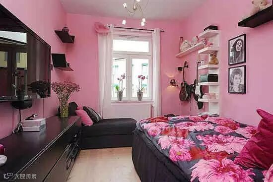 粉而不腻的色调让人看上去很舒服,柔和的淡粉色可以减少对眼睛的刺激,搭配深色的家具使整个空间显得不那么轻浮,大朵花卉的被褥又能中和黑色家具的压抑感,一柔一刚配合得恰到好处。