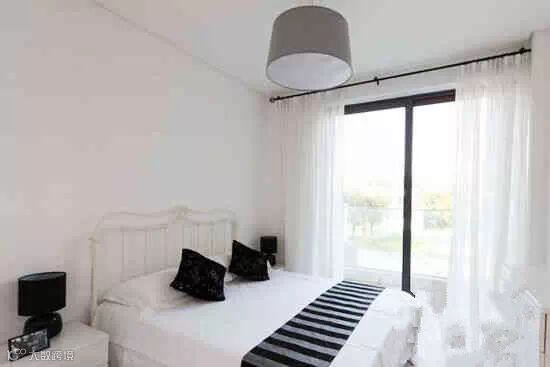 最传统的白色墙面,最原始的黑白灰搭配,却有一种说不上来的协调美。一色白色系的家具,用黑色的床头灯、黑色的靠垫和黑灰条纹床尾巾打破了沉闷的气氛,灰色的吊灯灯罩也让雪白的房顶从单调变得鲜活。