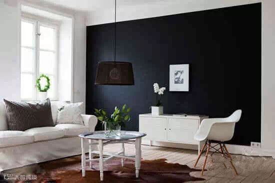 大面积的白色之中有一面纯黑的墙,带来的是“万绿丛中一点红”的效果,在黑色的背景中,任何颜色都会是突出的存在。白色的柜子、白色的花瓶和白色的挂画,简单的黑白配让客厅显得简约大气。