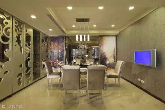 银灰色带花纹的壁纸让用餐区域显得典雅别致,于庄重之中多了几分瑰丽,现代欧式风格的餐桌椅与简约吊灯交相辉映,银色镂空玻璃推拉门缓和了整个空间的严肃感,油画式壁纸仿佛将人带进中世纪的贵族家庭。