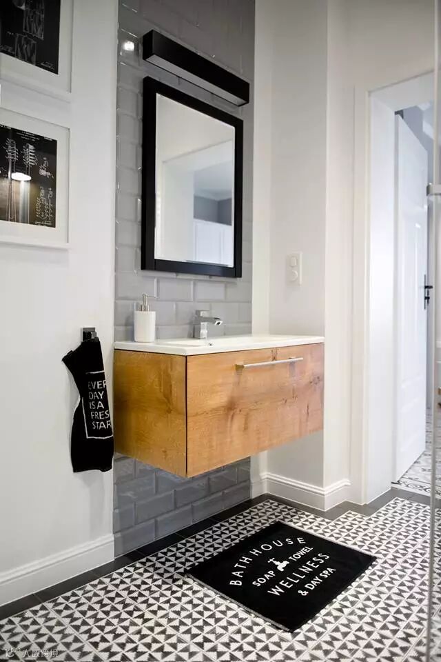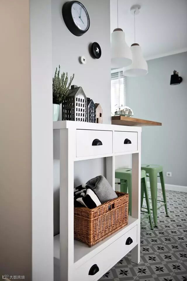 门厅区与厨房区,与起居室区域利用地面加以区分。门厅、厨房的地板利用黑白花纹砖拼接而成,质感自然带了出来。