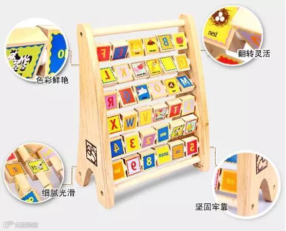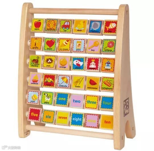 26个字母加上10个数字,组成这个新奇珠算架!每个字母的另一面对应的是最基本的图片和单词,每个数字的另一面则对应数字的英文字母。