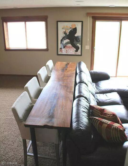 4、同样是一茶几为中心布置的合围式休闲区,但如果真的很少用到茶几的话,用也能脚蹬代替。沙发的背面往往是被忽略的区域,何不放一张长桌来合理利用空间。既能当做餐桌,也能当做工作桌。