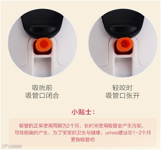 欧洲对婴幼儿吸水杯要求严格,由于是6个月以上的宝宝使用,从小孔的奶嘴转换成吸管怕呛着宝宝,就在吸管的前端加了一个“十”字切口,初次使用的宝宝需要费些力气,但学习适应一段时间就好了。