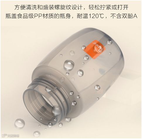 方便清洗和盛装螺旋纹设计,轻松拧紧或打开,瓶盖食品级PP材质的瓶身,耐温120C,不含双酚A。