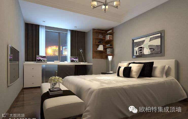 青春浪漫型是向传统的挑战,显示出主人叛逆的性格。为什么一个抽屉只用一个拉手?多用几个也可以。这种格调的另一个特点是处处显示出手工制作的痕迹,比如采用自由安装型的组合家具(钢管脚餐桌、帆布椅等)。欧柏特集成墙面给人一种简单、轻盈、活泼的感觉,隔段时间还能重新摆设,换换花样。