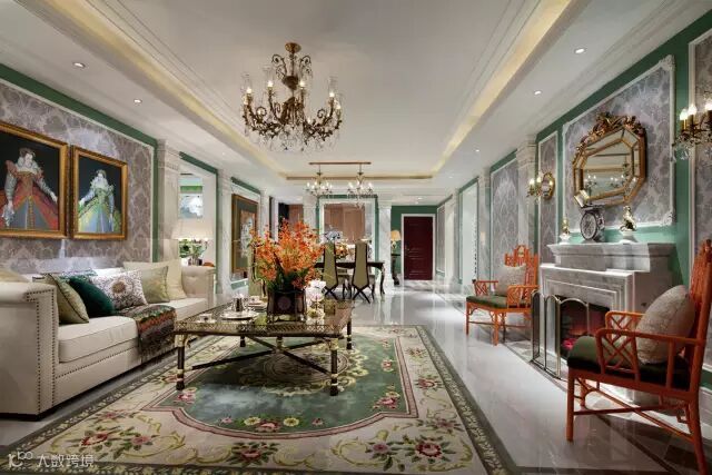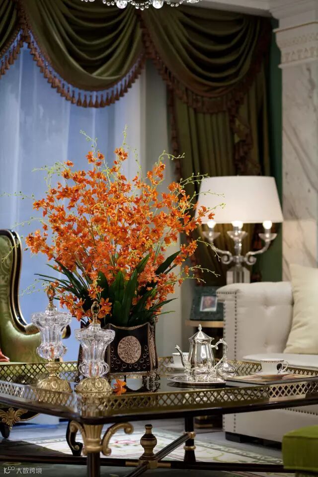 ▲客厅中央曼妙的灯光随影而下,带有古典韵味的造型,演化成了空间中不可或缺的艺术品。绿色的窗帘在微风的荡漾下飘逸,宛如流动的色彩,装点生活的每个细节。空间里不乏亮丽的橘色与绿色点缀,处处点精,展露出浪漫安逸的新贵族生活。